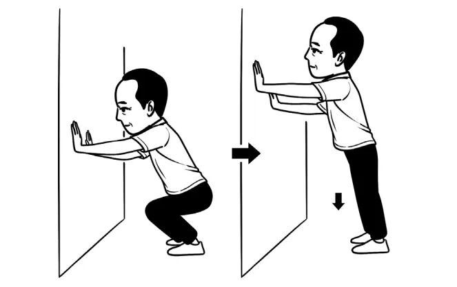 3.向前靠在固定的物体上,慢慢蹲下,保持两脚的足跟贴在地面上;当感觉跟腱和足弓将要上升离开地面且肌肉充分拉伸时保持10秒,然后直立。