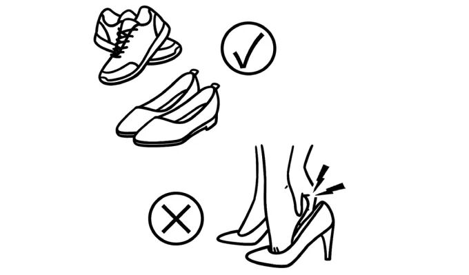 2.换双舒适的鞋,避免长时间穿着过软、过硬、底过薄或完全平底的鞋,平日建议穿运动鞋或坡跟鞋,但不要穿高跟鞋。