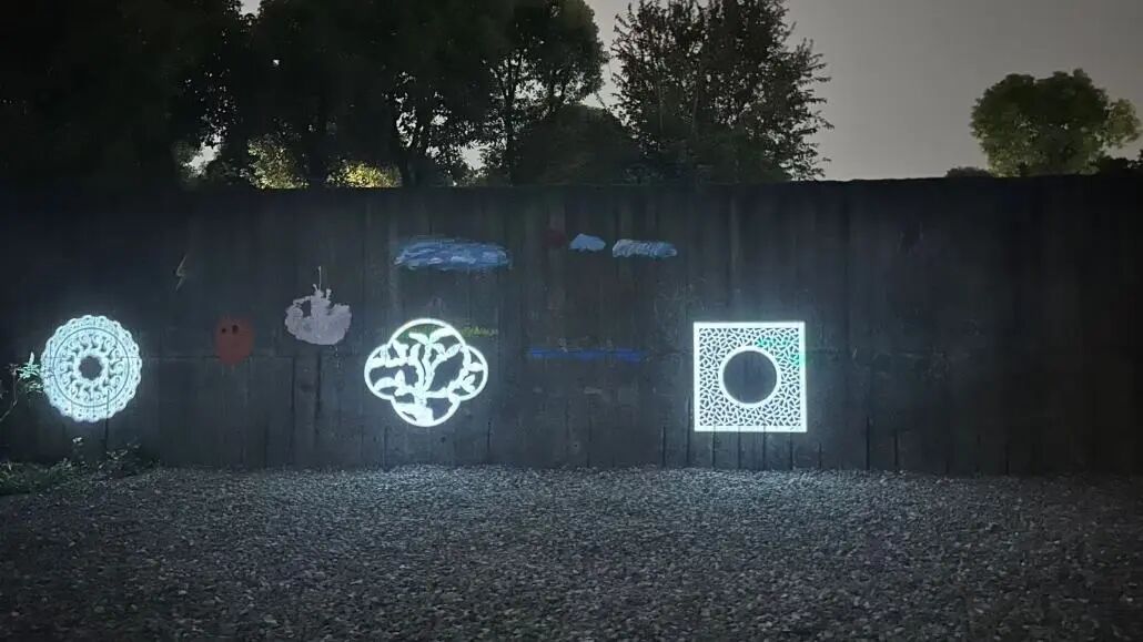 《园冶》视借景为“林园之最要者也”,“如远借,邻借,仰借,俯借,应时而借”。陈从周先生进一步提出“园外有景妙在‘借’,景外有景在于‘时’”。空间艺术季的展期是“时”,空间生产与共创机制更是可遇不可求的“时”。通过组织亲子墙绘活动,东起第三道素墙在展期变身为童趣盎然的自然天地长卷;得益于苏州市园林博物馆的创造性支持,来自拙政园、耦园、沧浪亭、豫园、网师园等五座江南名园的代表性花窗在夜间足尺投影于儿童所绘壁画之上,“收之圆窗,宛然镜游也”。山石理池,予始创者。