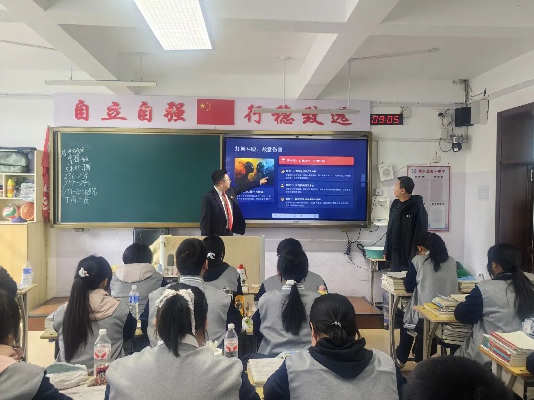 为进一步延伸司法服务职能,从源头预防青少年违法犯罪,近日,明水县人民法院法官、明水一中法治副校长赵世奇走进明水县第一中学校园,为全校学生开展了一场形式多样、内容丰富的法治教育系列活动。活动采取“集中广播宣讲+进班级互动讲解”的分层授课模式,旨在增强学生法治观念和自我保护意识,有效预防校园欺凌与青少年违法犯罪,助力营造安全、文明、和谐的校园育人环境。明水一中副校长陈朋主持本次活动。
