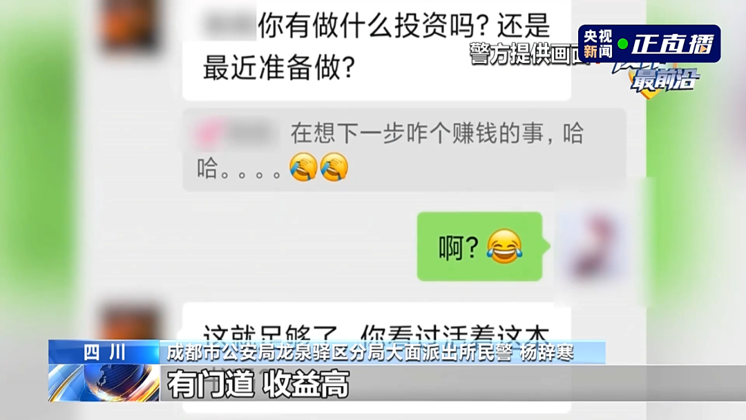 成都市公安局龙泉驿区分局大面派出所民警 杨辞寒:她说大约10天前有人找她,要租她的铺面并且很爽快的交了2000元订金,说半个月后回来签合同。从那以后,对方每天都找她聊天,嘘寒问暖。熟悉之后就跟她讲,平时对方在搞黄金投资,有门道、收益高,还发一些虚假的盈利截图,受害者慢慢就被洗脑了。
