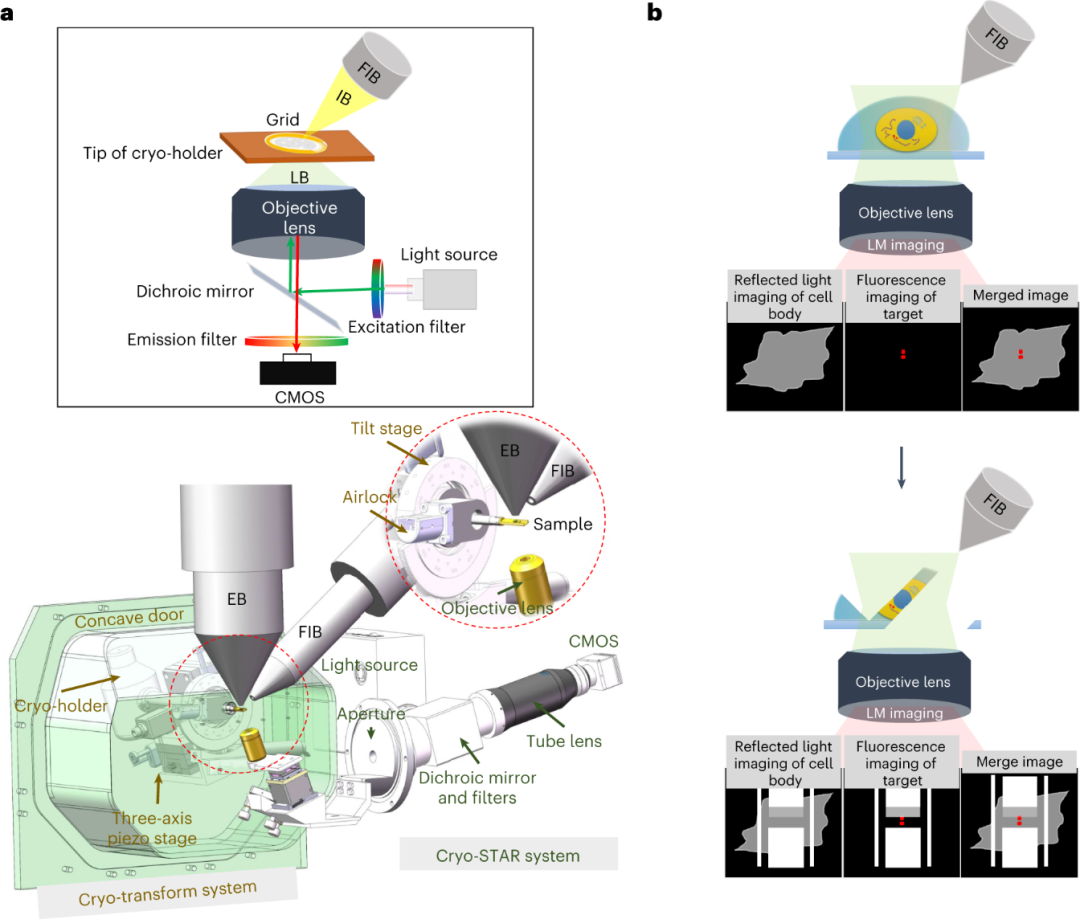 ELI-TriScope系统核心理念可概括为“将荧光监控引入聚焦离子束减薄现场”。该系统在双束扫描电镜(SEM)内部集成了两套关键模块:一套基于冷冻样品杆的传输系统,另一套为内嵌的倒置宽场荧光成像系统(cryo-STAR)。通过精密校准,实现了电子束、离子束与光束三者聚焦于样品台上的同一点。
