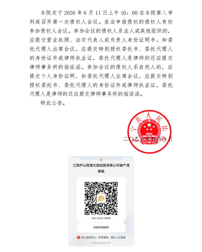 原标题:《江西庐山西海文旅控股有限公司破产清算案申报债权公告》