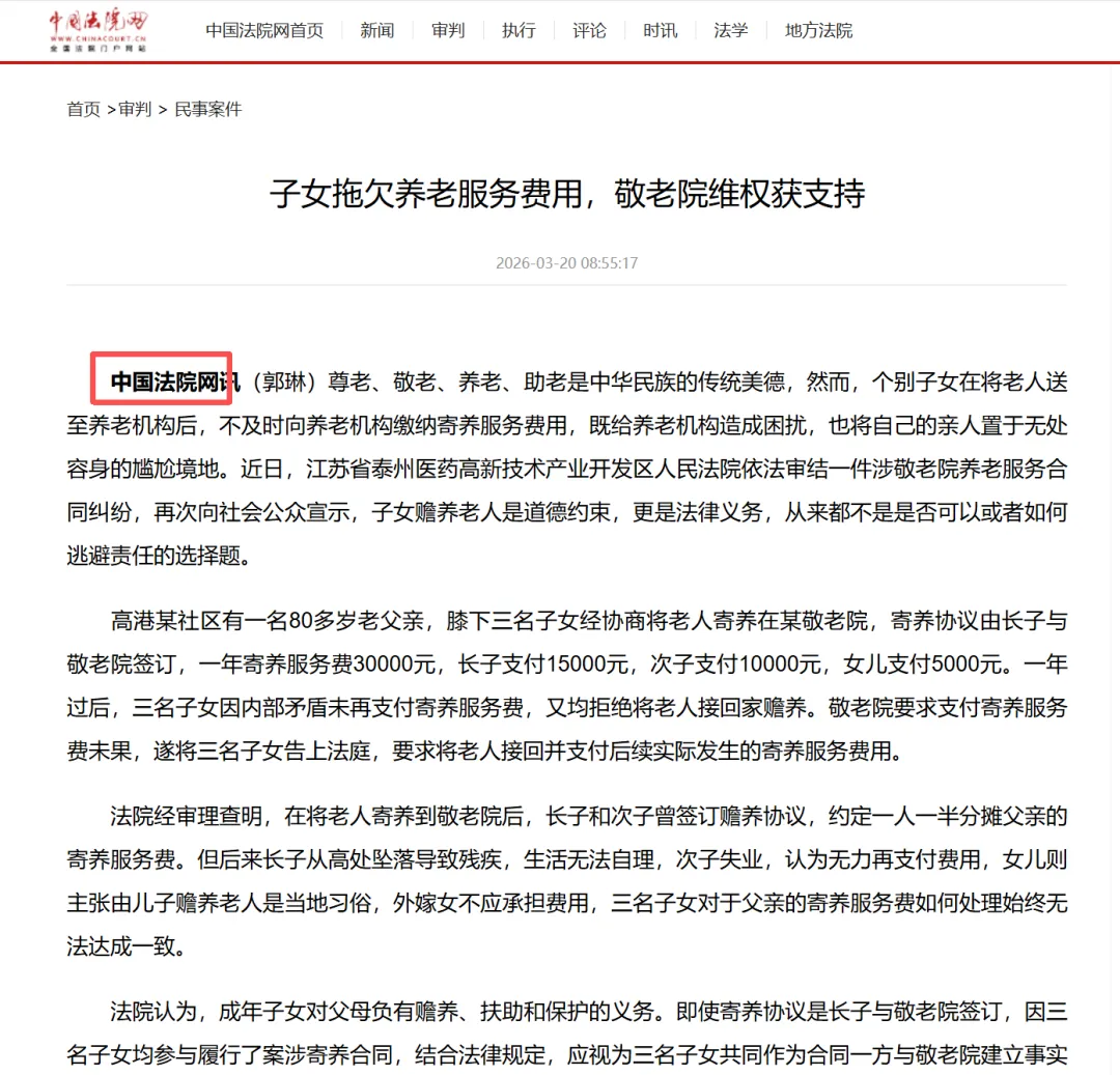 【影响力】中国法院网:子女拖欠养老服务费用,敬老院维权获支持