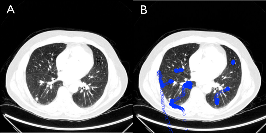 A:嵌入大猩猩图案的胸部CT图像。 B:1名未报告看见大猩猩的放射科医生的眼动轨迹图。每个圆圈代表1毫秒内的眼动位置。