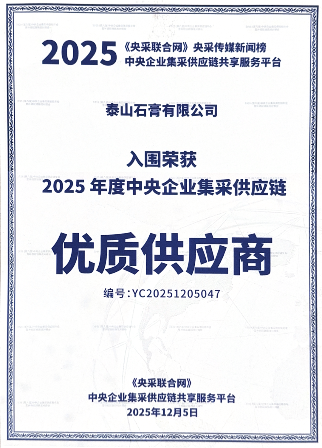 泰山石膏获评2025年度中央企业集采供应链优质供应商