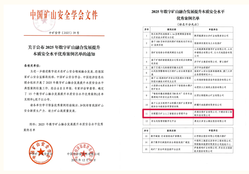 近日,由国家矿山安全监察局指导、中国矿山安全学会与中国经济信息社联合主办的“2025年数字矿山融合发展提升本质安全水平优秀案例”名单正式公布。信云智联携手承德宝通矿业联合申报的“非煤露天矿山人工智能安全管理平台”成功入选。这一成果,是对双方技术创新与实践落地能力的权威认可。