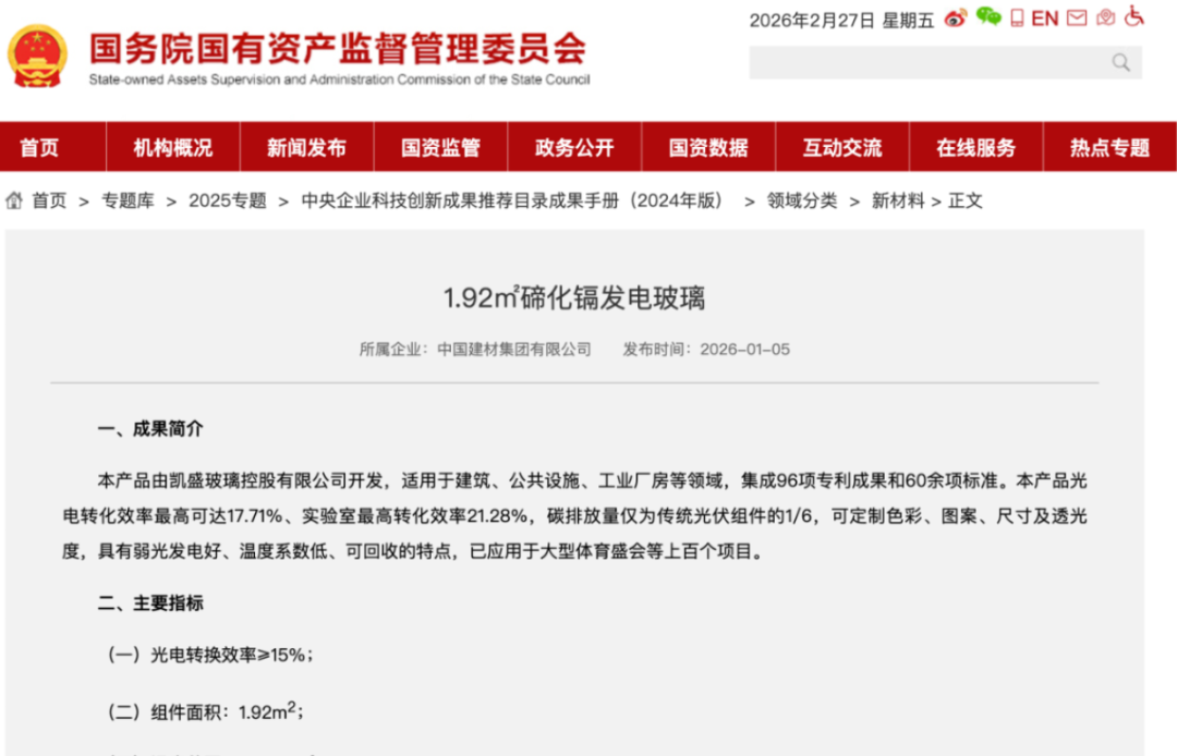 近日,国务院国资委印发的《中央企业科技创新成果推荐目录(2024年版)》中,收录了电子元器件、零部件、新材料等7大领域共263项成果,凯盛玻璃控股有限公司自主研发的1.92㎡碲化镉发电玻璃成功入选。从入选国家级推荐目录,到持续打破自身创造的效率纪录,凯盛集团持续诠释中国新材料创新的厚度与速度。