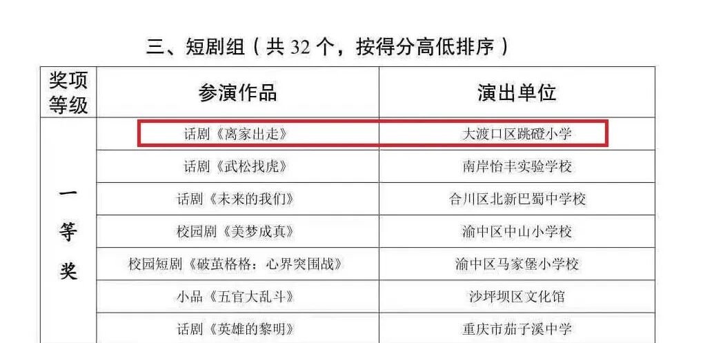 在重庆市第九届中小学戏剧小梅花展演活动中,大渡口区跳磴小学家庭教育主题原创话剧《离家出走》荣获短剧组一等奖!