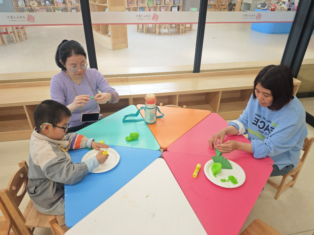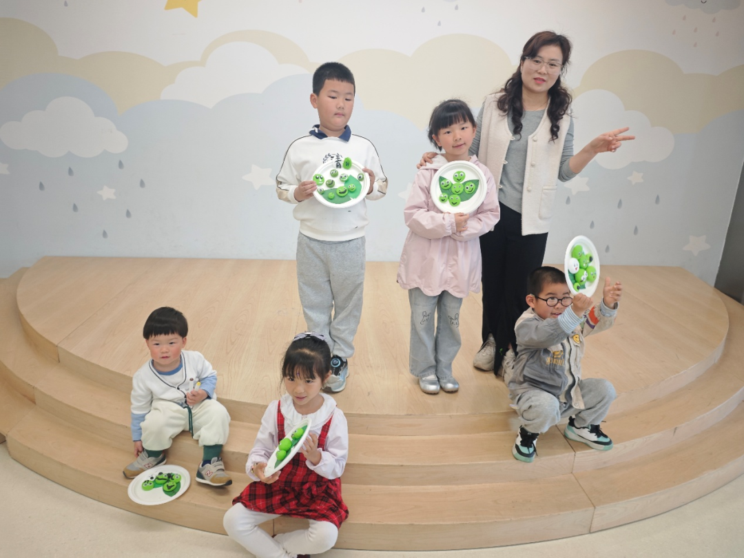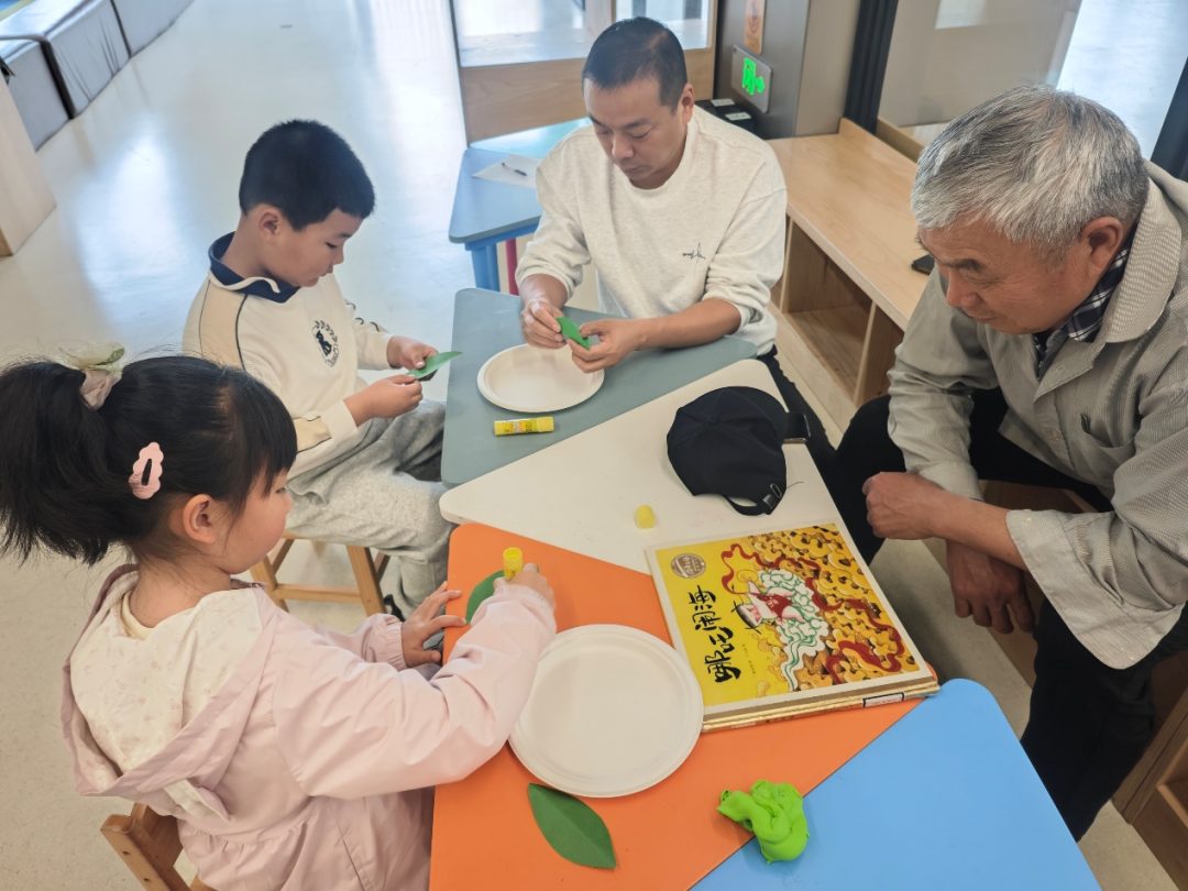 亲子手工——“青团子”。正值清明时节,老师为孩子们发放了黏土和工具,孩子们在家长的帮助下揉搓黏土,做成一个个圆润可爱的绿色团子,有的还加上了小叶子装饰。小小的青团,既是对传统文化的体验,也是一次温情的表达与疗愈。