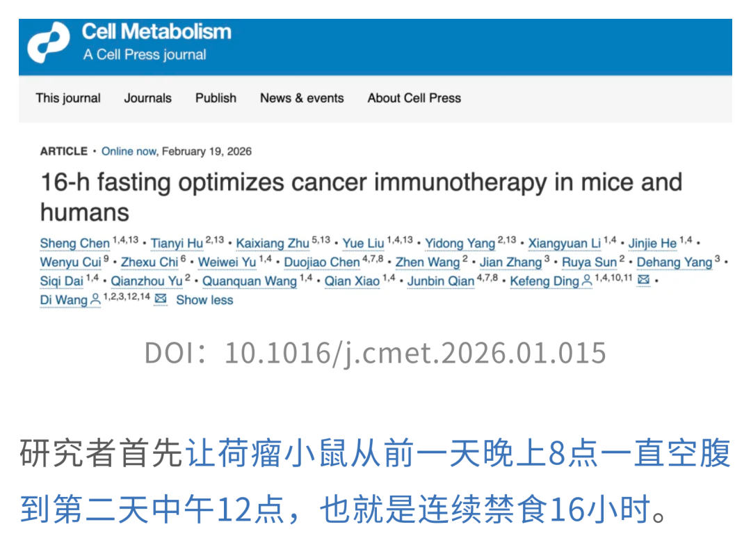 [1]Chen S, Hu T, Zhu K, Liu Y, Yang Y, Li X, et al. 16-h fasting optimizes cancer immunotherapy in mice and humans. Cell Metab. 2026;38:1–19. https://doi.org/10.1016/j.cmet.2026.01.015.