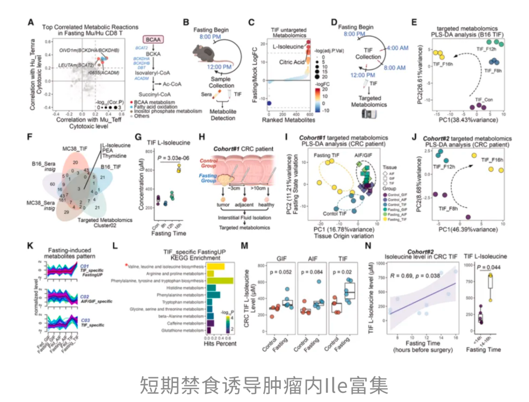 研究团队顺着代谢这条线往下挖,他们发现,大约16小时的短期禁食,足以特异性地重塑肿瘤微环境中的代谢状态,让异亮氨酸(Ile)在肿瘤内部明显富集,这正是肿瘤内CD8⁺T细胞重新恢复战斗力的重要基础。