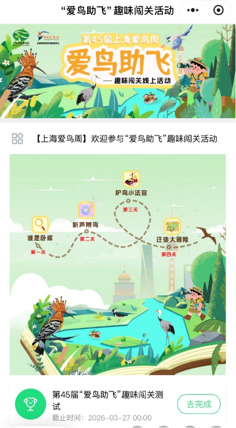 同步上线的“爱鸟助飞”趣味闯关线上活动,面向上海市中小学生开放,设置科普知识、普法竞答、互动绘画等趣味关卡,参与者完成闯关后可领取电子证书并参与抽奖,以寓教于乐的方式传播爱鸟护鸟理念。