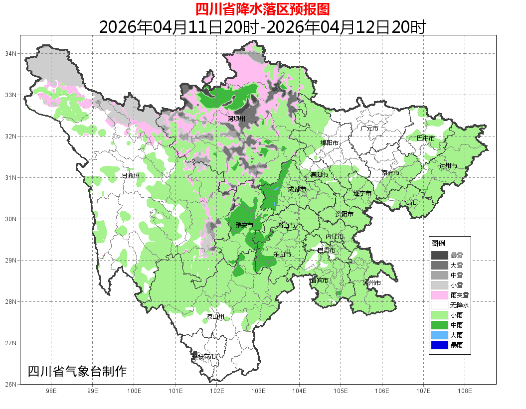 12日晚上到13日白天:盆地各市阴天,大部地方有阵雨或雷雨,其中西南部、南部和东北部的部分地方有中雨,局地大雨;川西高原大部和凉山州北部阴天间多云有阵雨(雪)或雷雨,部分地方有中雨(雪),局地大雨(雪),高海拔山区有暴雪,攀西地区其余地方多云间晴。