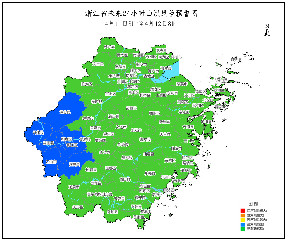 省水利厅、省气象局4月11日8时25分联合发布山洪灾害预警:根据省气象台未来降雨预报,预计4月11日8时至4月12日8时,淳安县、柯城区、衢江区、常山县、开化县、龙游县、江山市、遂昌县可能发生山洪灾害(蓝色预警)。