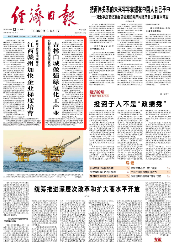 经济日报一版头题:发挥新能源资源优势 吉林白城做强绿氢化工产业