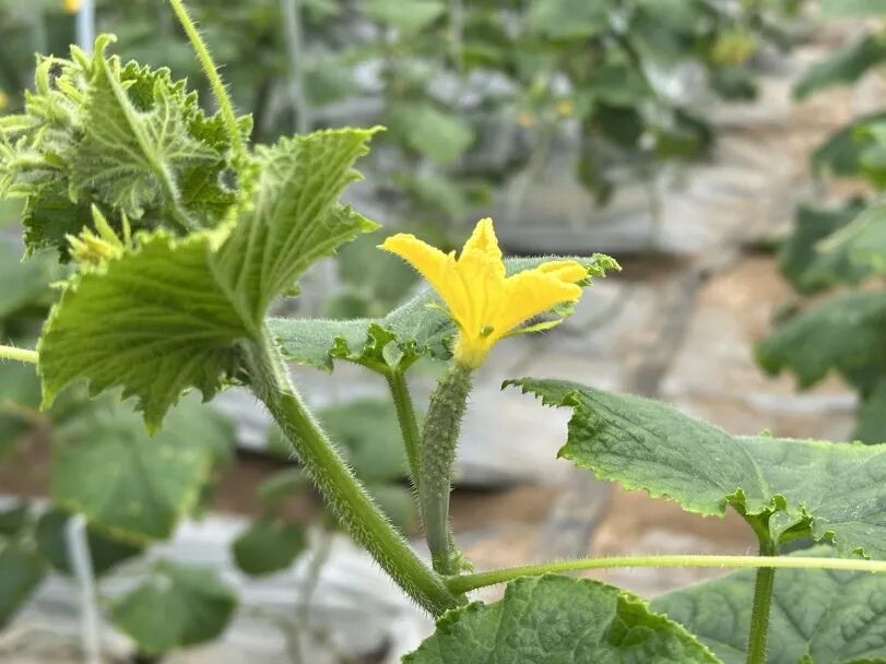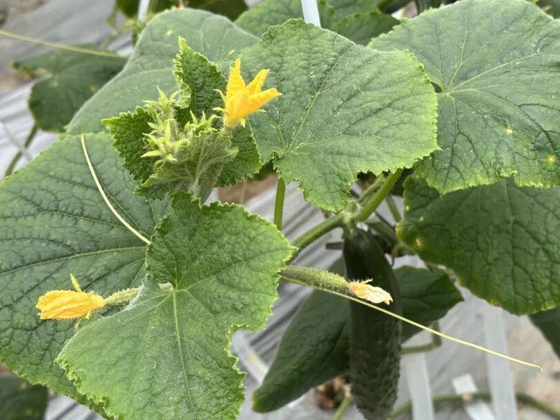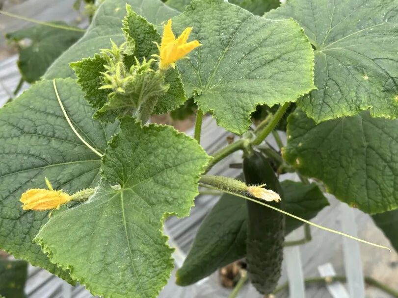一旁的黄瓜也不甘示弱,翠绿的藤蔓顺着支架向上攀爬,鲜嫩的黄瓜带着细密的小刺,笔直地垂挂在叶间。顶花带刺的模样,是春日最新鲜的标志,咬一口脆嫩多汁,清冽回甘,满是田园的清爽气息。