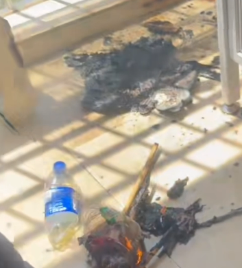 阳台内堆放的纸壳已烧成灰。图源:江西消防