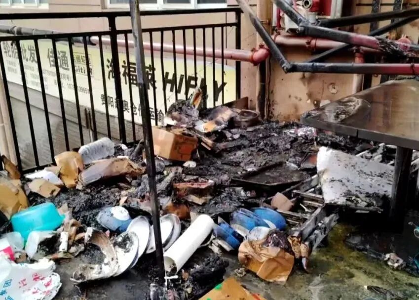 2025年12月10日,贵州贵阳一小区单元楼下的平台区域突然起火,起火点为商铺门口堆放的纸箱,起火原因为高空抛下的未熄灭烟头引燃纸箱。