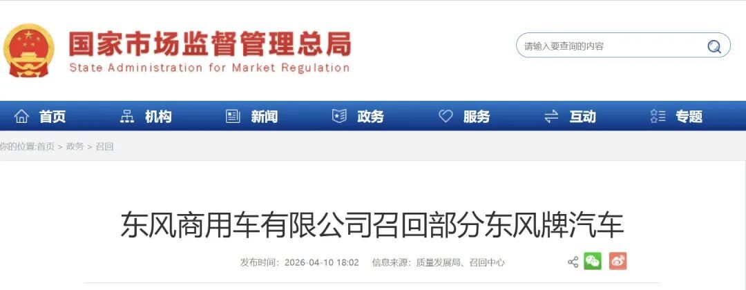 召回编号S2026M0041V:自即日起,召回2025年4月1日至2025年12月9日期间生产的部分东风D560载货系列、D310载货系列、牵引KL系列、牵引纯电动系列汽车,共计15104辆。