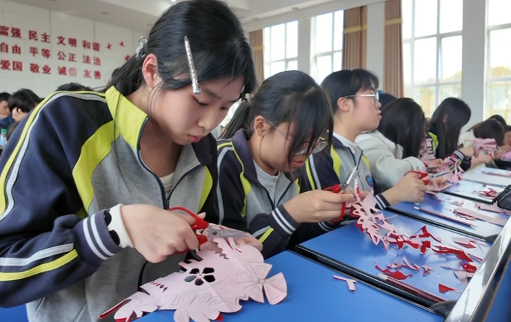 除了沉浸式农耕体验,学农实践活动还精心设置了传统文化课程,带领学子们感受中华优秀传统文化的深厚底蕴。在传统剪纸课堂上,同学们以“五谷丰登”为创作主题,手持剪刀在彩纸上自由创作,不一会儿,花卉、稻穗、瓜果等图案跃然纸上。