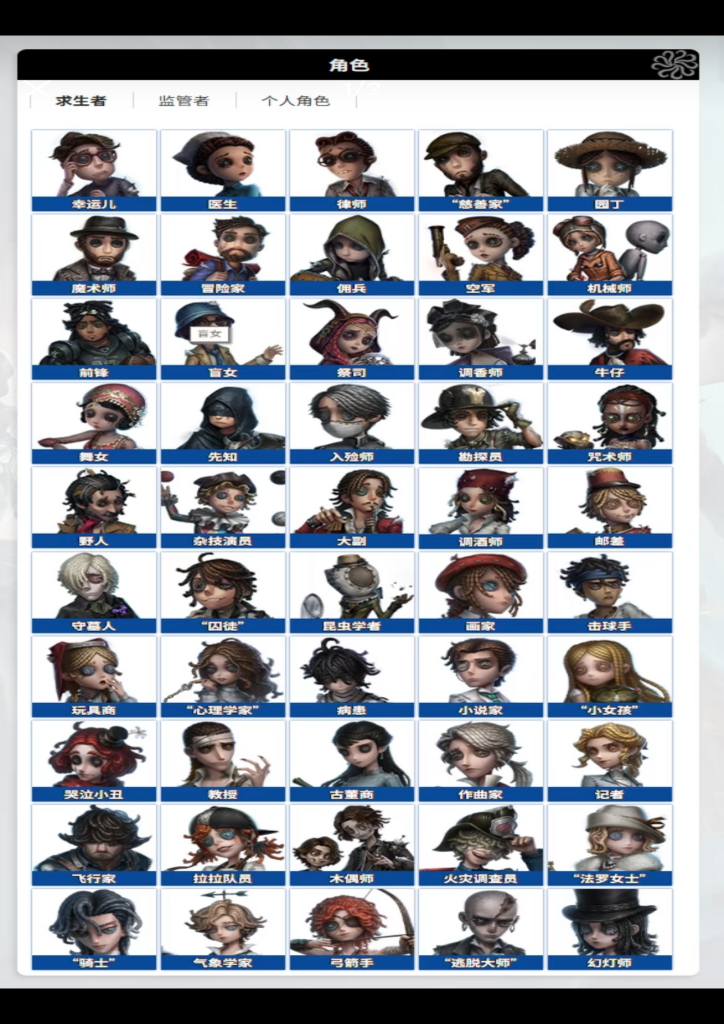 作为一款非对称竞技类游戏,《第五人格》自上线以来便在受众玩家中保持着高度的活跃。它之所以令人沉迷,不仅在于其游戏对抗机制的博弈性,更在于它从最直观的视觉层面建立了一套具有维多利亚时代怪诞色彩和哥特布偶风格的审美模式。在其他游戏通过“捏脸”以追求AI仿真的极致美感时,《第五人格》通过非标准化的外形设计为玩家提供了一种新颖的视觉体验,成为它破圈的核心动因。在它打造的一系列视觉符号中,最具症候性的特征便是游戏中求生者面部的纽扣眼。值得注意的是,每一位求生者的眼睛无一例外地全被设定为了“纽扣眼”。