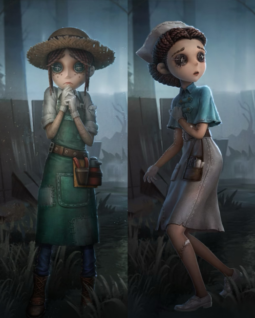 纽扣眼和角色玩偶化唤起了玩家对童年旧物的追忆。除了标志性的纽扣眼,求生者的服饰也多呈现出陈旧磨损和反复补丁的样态,比如园丁磨损的草帽和医生充满褶皱和补丁的制服,这些充满时间磨损痕迹的细节塑造出了被忽视遗弃的可怜玩偶形象,唤起玩家关于童年时代被遗弃在角落、落满灰尘的旧玩偶的温情记忆。当这些少有反抗能力的玩偶在庞大的监管者的追击下艰难求生时,玩家会本能地萌生出保护受损玩偶的怜悯之心。与此同时,“纽扣眼”的存在又时刻提醒着玩家求生者“似人非人”的怪诞本质。这种又爱又怕的情感张力正是求生者的视觉美学促使玩家产生深度沉迷的核心机制。