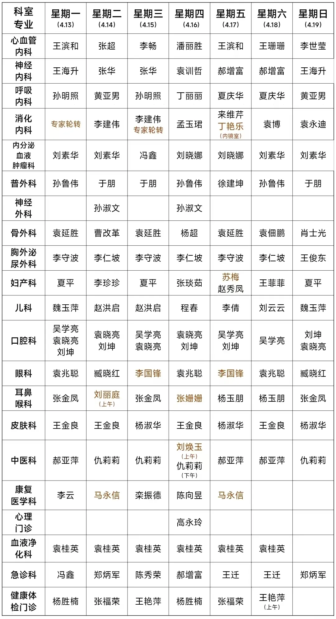 2026年4月13日-4月19日潍坊市人民医院滨海分院门诊值班医生一览表