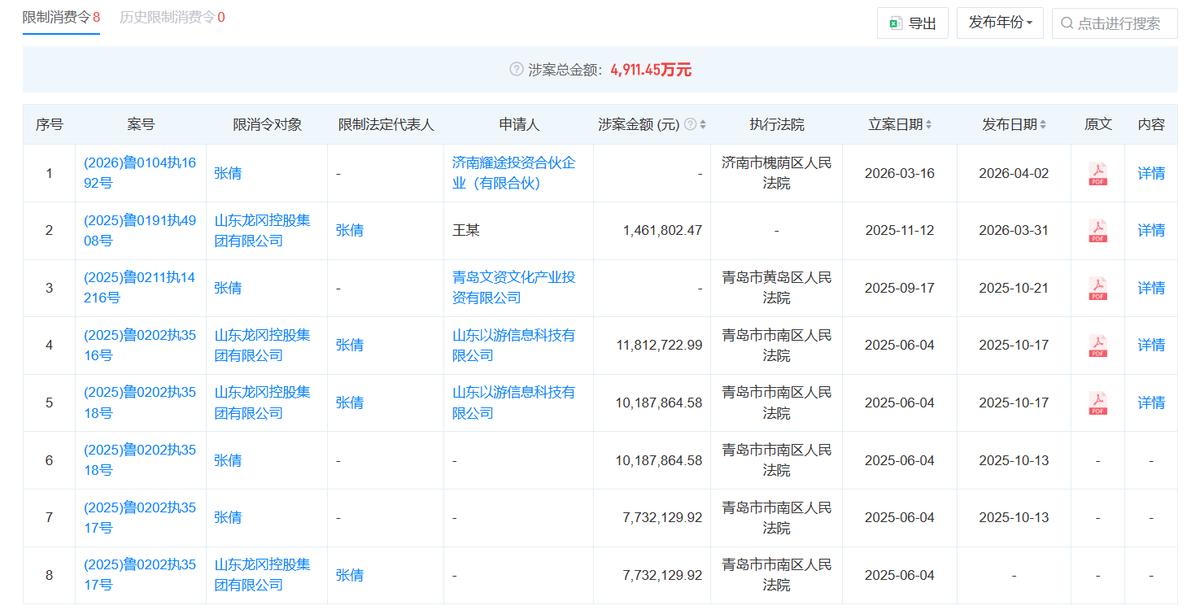 截至目前,张倩已8次被法院限制高消费,涉案总金额4911.45万元。其中,涉及2起民间借贷纠纷案件,因张倩和山东龙冈控股集团有限公司未按执行通知书指定的期间履行生效法律文书确定的给付义务,分别被青岛市市南区人民法院和济南市槐荫区人民法院采取限制消费措施。
