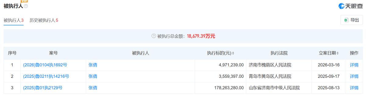 3月30日,张倩被济南市槐荫区人民法院列入失信被执行人名单,失信被执行人行为具体情形为“违反财产报告制度”,被执行人的履行情况为“全部未履行”,立案时间为2026年3月16日。
