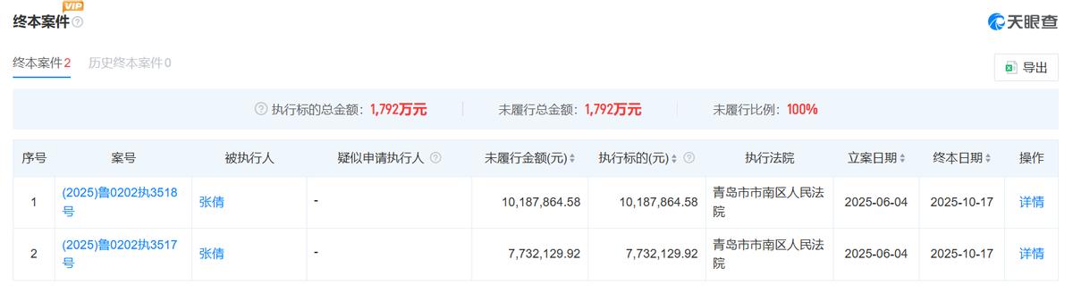 此外,张倩还存在2条终本案件信息,被执行标的总金额1792万元,未履行总金额1792万元,未履行比例高达100%。