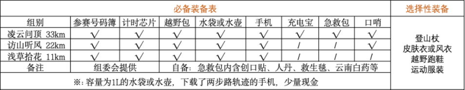 (1)参赛选手必须携带以下物品和装备参加比赛越野跑服装、鞋、水袋包或运动水杯。