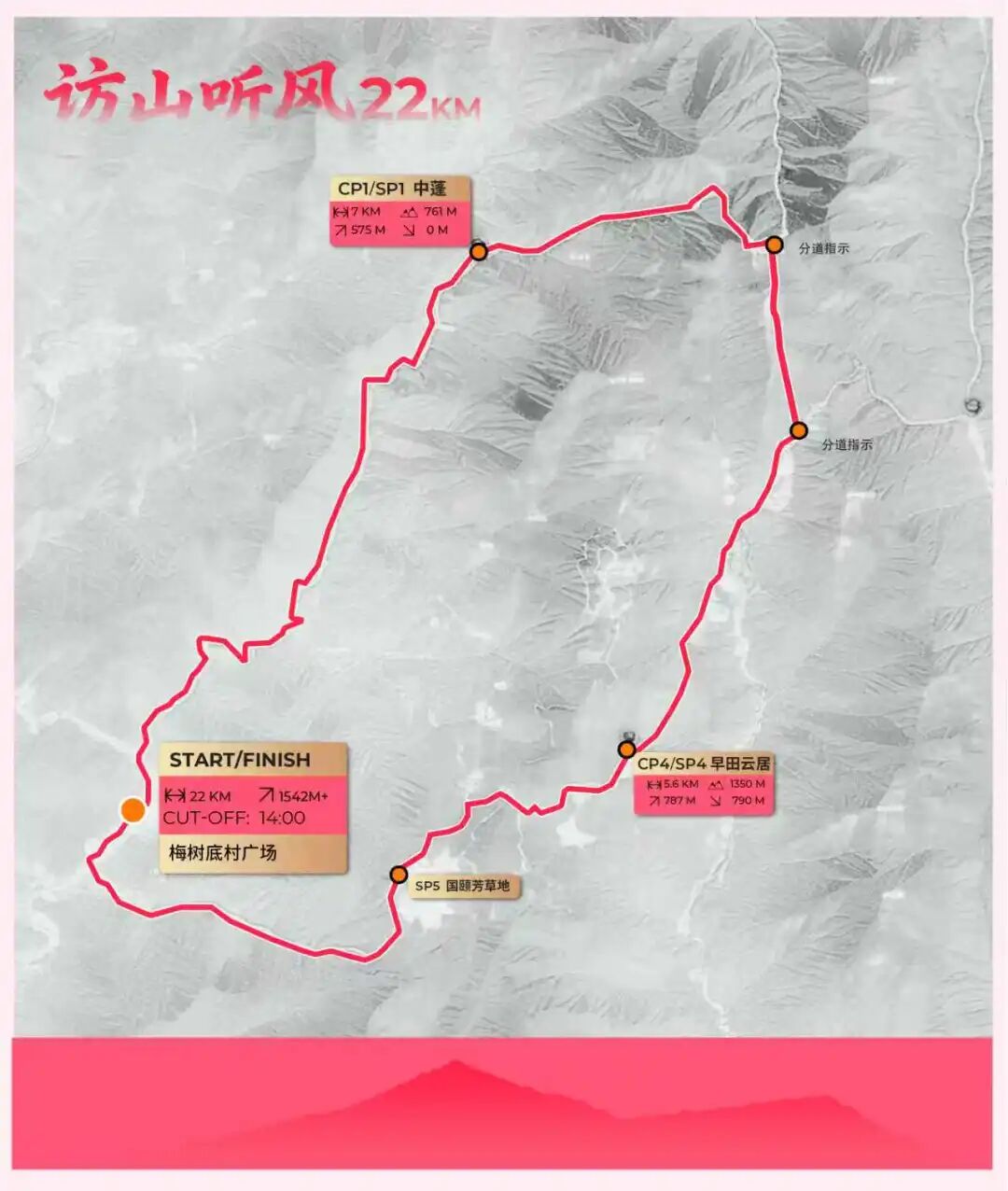 全程约22.2km,海拔爬升1542m,关门时间7小时,ITRA积分1分。