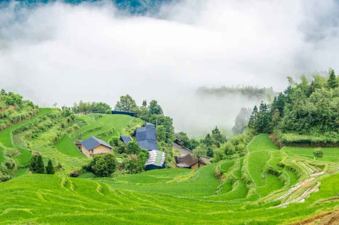 站在梯田最高处,观九曲云环,层层叠叠的梯田位于青山绿水间,宛如油画般绚烂,眼前绝美的田野风光,让人不得不感叹大自然的神奇!