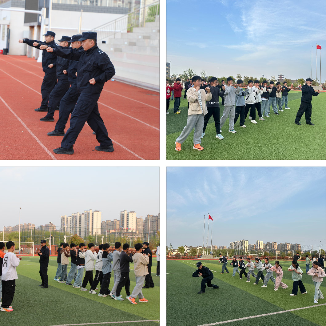 专题讲座结束后,活动进入高潮环节。定远县人民法院法警大队5名法警为60余名学生代表现场教授军体拳。法警们首先进行分解动作示范:弓步冲拳、穿喉弹踢、马步横打……一招一式刚劲有力、干净利落;随后,五人连贯展示整套动作,整齐划一的英姿、虎虎生风的拳法赢得了同学们阵阵掌声与欢呼声。示范结束后,学生们分成五组,五名法警分别带领一组同学展开教学。法警们从基础站姿、握拳手法到发力要点,逐一耐心讲解。同学们热情高涨,认真学习每一个动作。为了帮助同学们掌握要领,法警们不断穿梭在队列中,俯身纠正学生的手臂角度,轻轻按压肩膀调整重心,手把手指导踢腿的高度和方向。操场上,法警的口令声、同学们的呼喝声此起彼伏,气氛热烈而有序。