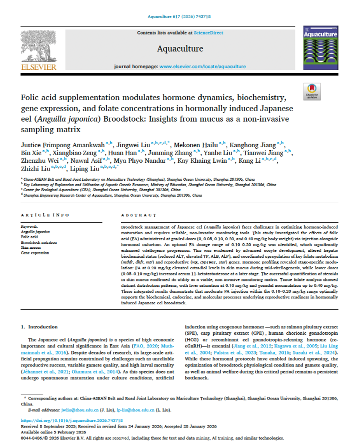 发表于《Aquaculture》的论文第一作者为实验室加纳留学生Justice Frimpong Amankwah,通讯作者为刘利平教授和刘经纬老师。相关研究获得农业农村部政府购买项目、上海市农委科技攻关和上海市科委项目等资助。经过18年的持续积累,团队已围绕鳗鲡人工繁殖方向培养研究生33名,发表相关论文37篇,申请专利11项,逐步形成了结构较为合理、研究方向稳定的科研梯队和持续创新基础。