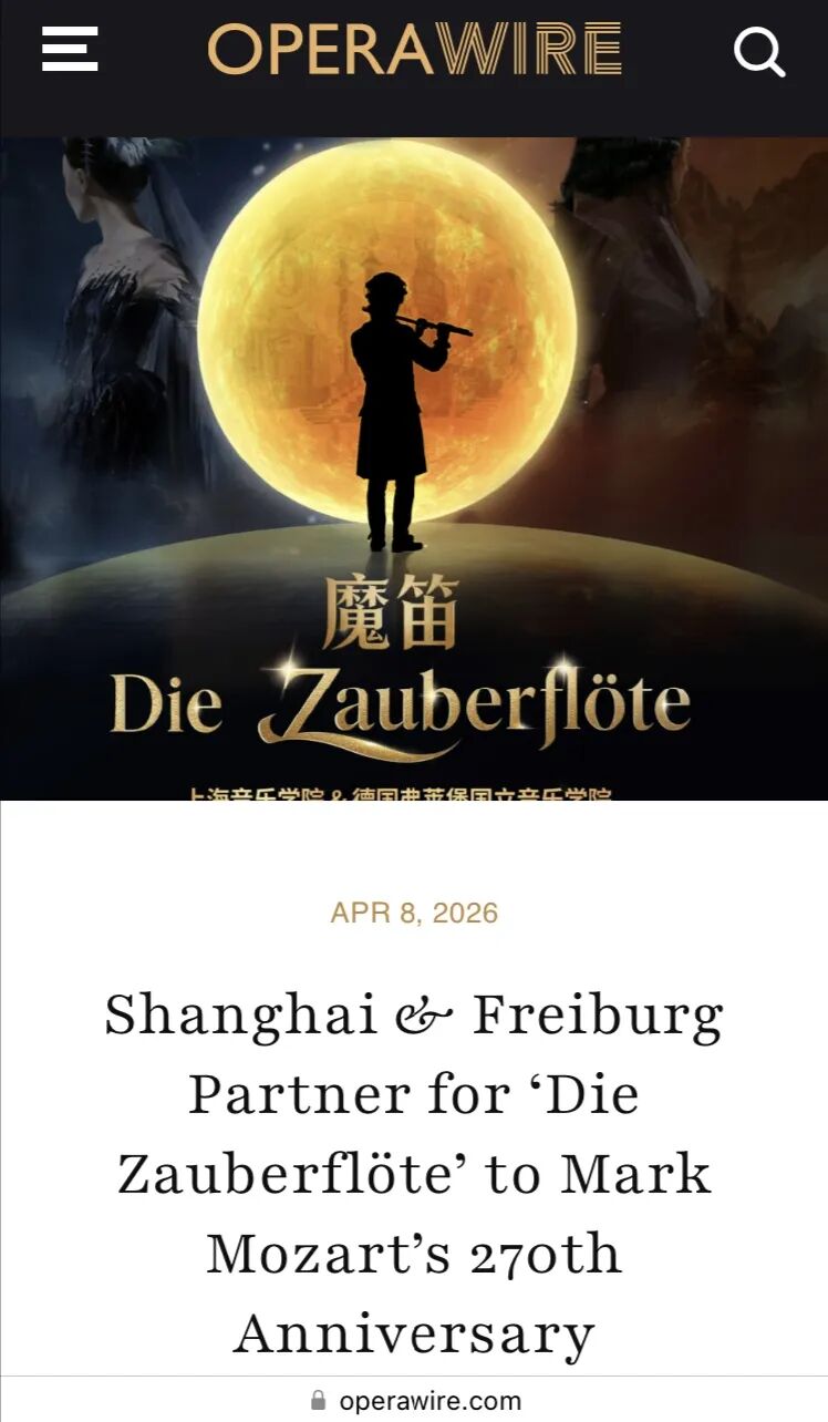 国际权威歌剧媒体Operawire特别关注上音版《魔笛》在上音歌剧院的演出。乐评人及业内人士均对这一版《魔笛》带来的惊喜表示感动,“这些年轻的歌手正用他们最纯粹的热爱与勇气演绎歌剧中的光明”“上音版《魔笛》的舞美理念堪称中国歌剧制作的元年”……