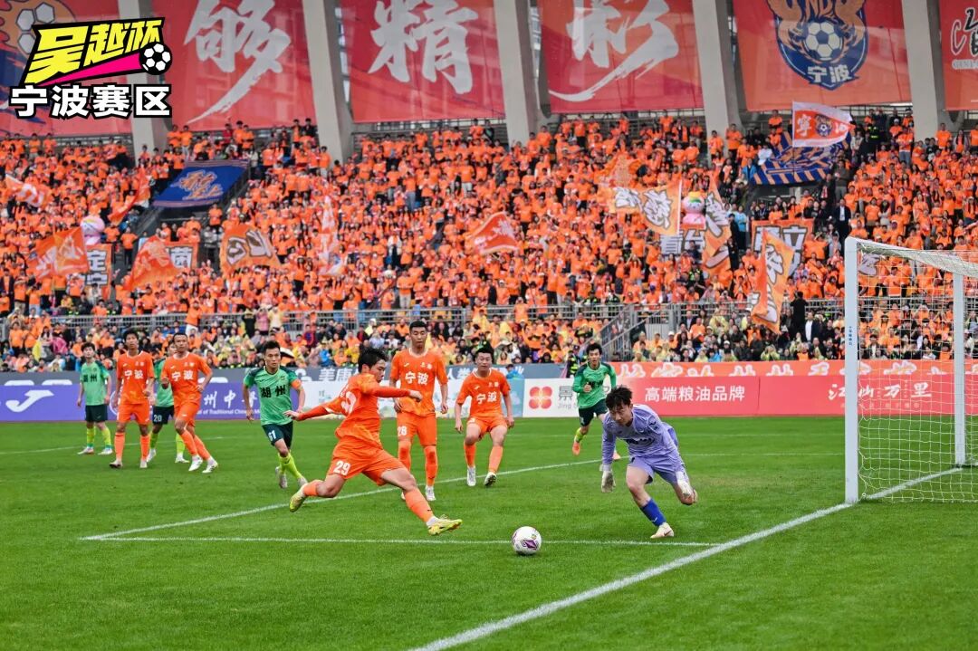 4月12日下午,“吴越杯”第二轮宁波队对阵湖州队的比赛,超过9000名观众涌入宁波奉化体育中心,将看台装点成橙色与蓝色的海洋。