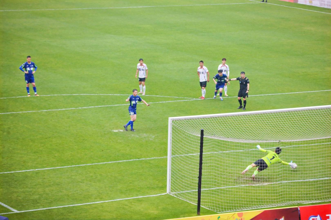 上半场第35分钟,进球来了——温州队开出任意球,黄景峰顺势一拨,34号薛宇皓心领神会,一记世界波,球直奔死角,对方门将望球兴叹。温州队1:0领先结束上半场。