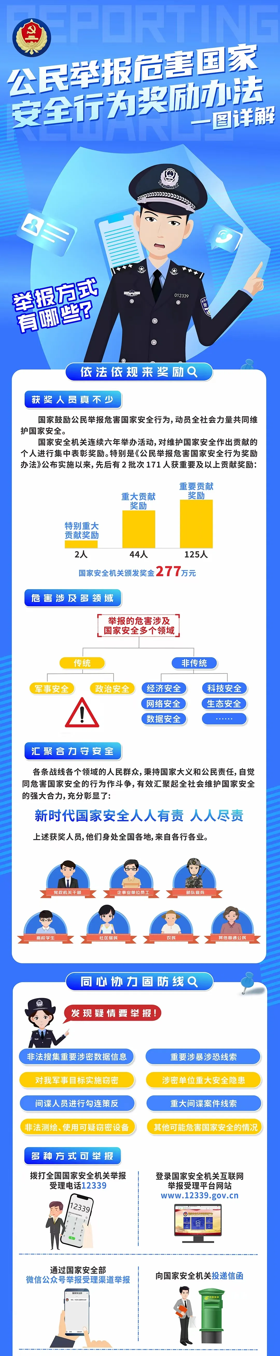 《公民举报危害国家安全行为奖励办法》公布实施以来,为推动引导广大人民群众参与支持国家安全机关工作、共同维护国家安全发挥了重要作用。特别是通过12339国家安全机关举报受理电话、网络举报平台(www.12339.gov.cn)、国家安全部微信公众号举报受理渠道等,广大人民群众得以积极反映危害国家安全的可疑情况,为国家安全机关依法发现、防范、制止和惩治各类危害国家安全的活动提供了有力支持。让我们一图详解主要内容,进一步提高国家安全意识和素养,共同筑牢国家安全人民防线。