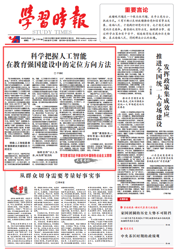 近日,《学习时报》头版刊发北京师范大学校长于吉红署名文章《科学把握人工智能在教育强国建设中的定位方向方法》。