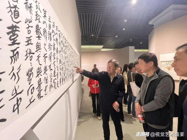 展览现场,朱永灵的简帛书作品成为众人关注的焦点。资深媒体人蔡树农长期关注朱永灵艺术创作,他评价道,朱永灵是当代简帛书创作领域最具实力的书法家之一,与鲍贤伦先生堪称该领域的代表性人物。展厅中,近18米长的录老子甲本《道德经》书法作品独占整面展墙,气势恢宏、震撼人心,吸引众多观众驻足欣赏、细细品读,岳麓书院山长陈松长也现身现场,为随行学生细致导览讲解。