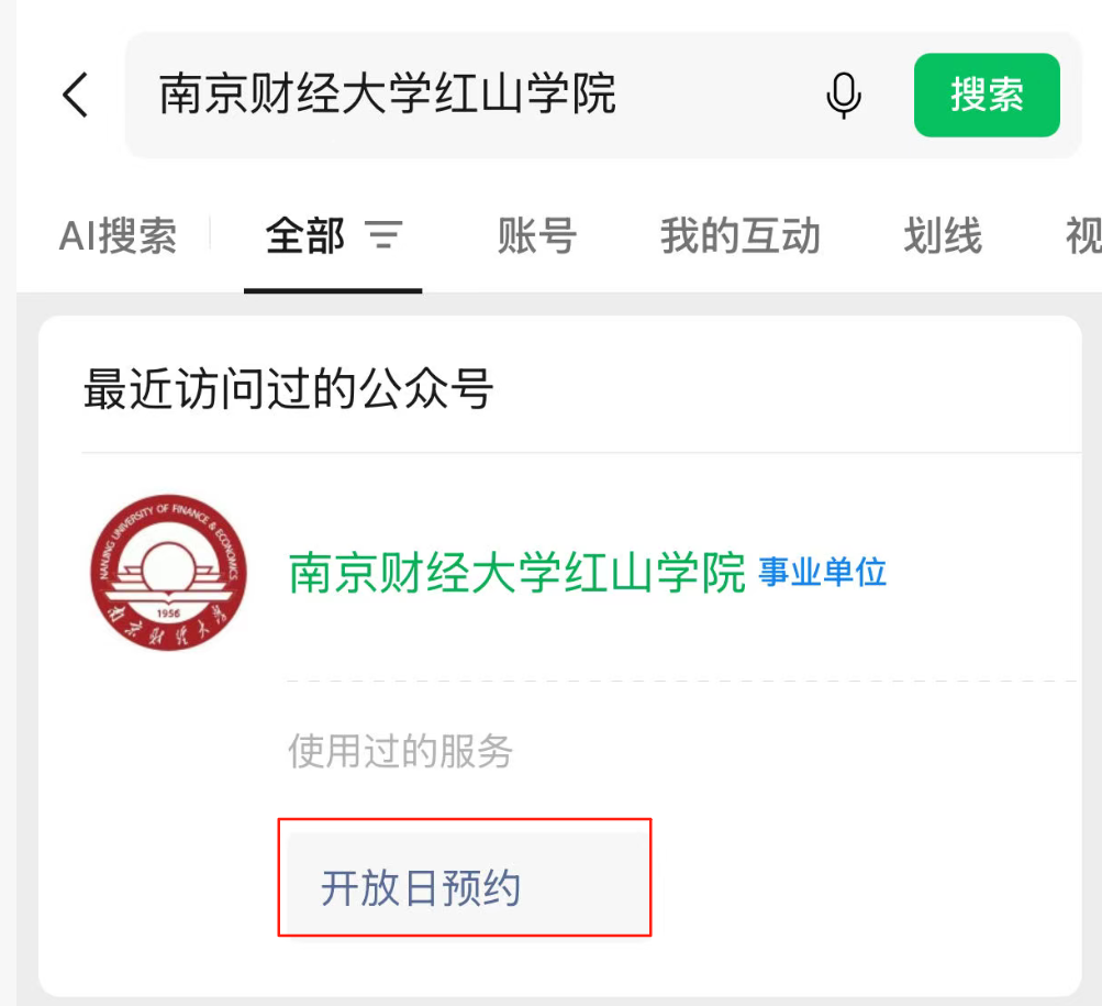 2. 校外人员入校:校外人员可关注“南京财经大学红山学院”公众号后申请入校。具体流程为:打开微信“南京财经大学红山学院”公众号--点击“私信”--点击下方“校园服务”--点击“开放日预约”,按页面要求输入访客真实信息后提交。