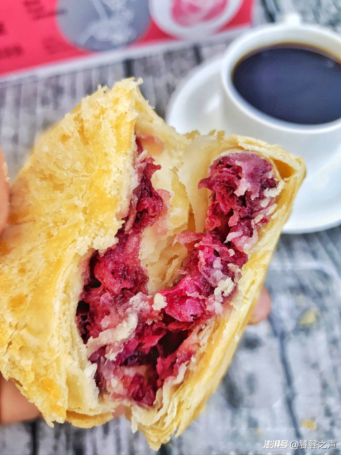 鲜花饼是玫瑰入馔的经典之作。酥皮起千层却不油腻;玫瑰馅用蜂蜜腌制半月以上,苦涩尽去,只留醇香。但创造力不止于此。