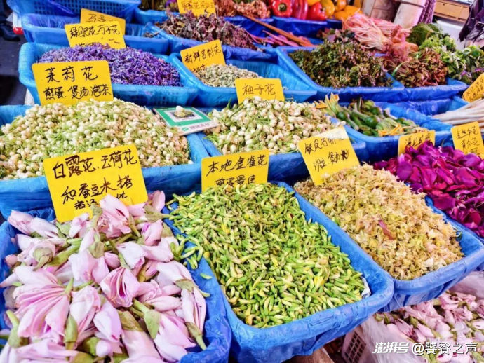 清晨的市场角落,竹篮里的槐花还带着露水,旁边的茉莉花苞紧实如玉,而新加入的棠梨花簇拥成团,金雀花则绽开明亮的鹅黄。不知何时起,吃花这件事从文人雅士的风雅,变成了普通人触手可及的生活仪式。社交平台上,“春天吃花大赛”浏览记录不断攀升,藏着这个时代与花朵最亲密的接触方式。