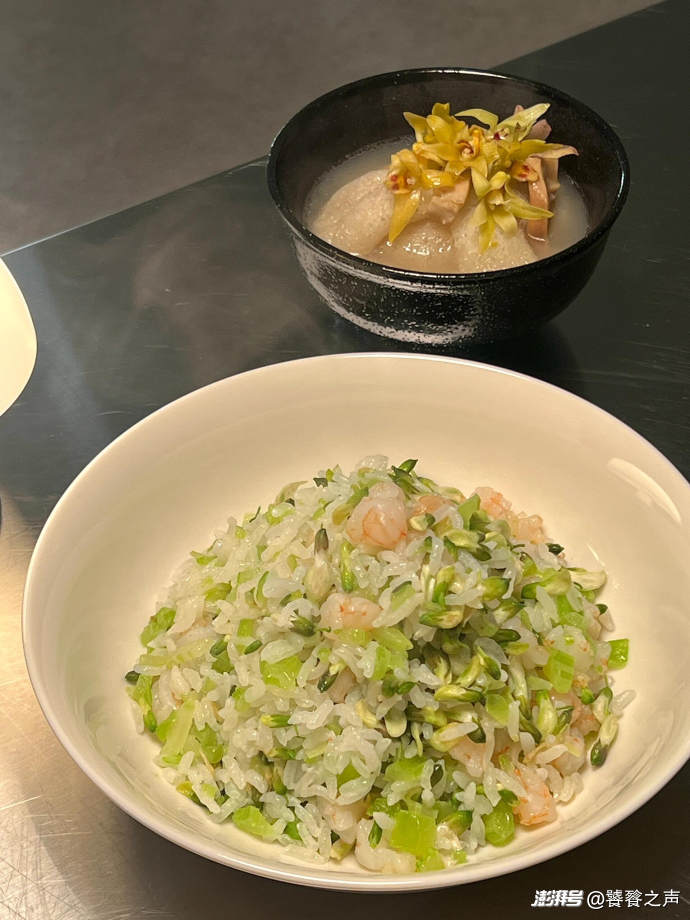 最惊艳的可能是那道“茉莉虾仁”。新鲜茉莉花苞在热油中快速滑过,与虾仁同炒,花苞在高温下微微绽开,释放的香气全部被虾仁吸收。装盘时,几朵完整的茉莉花作为点缀,整道菜如同一幅写意画。茉莉的妙处就在那一缕香气,需要先闻,再品。