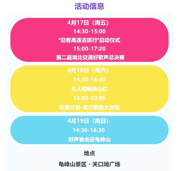 4月17日-19日,龟峰山景区关口坳广场,星光集结、金曲连唱、全民合唱,在花海与音浪之间,邀你共赴春日最美音乐之约!