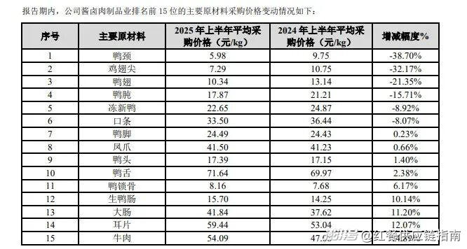 煌上煌的主要原材料有鸭翅、鸭脖、白条鸭等相关鸭副产品。2025年上半年,这些原料的市场价格处于低位。其中,鸭颈采购均价同比下降38.70%,一公斤便宜了3.77元;鸭翅下降 21.35%,一公斤便宜了2.8元;鸭肫下降15.71%,一公斤便宜了3.34元;冻新鸭下降 8.92%,一公斤便宜了2.22元。
