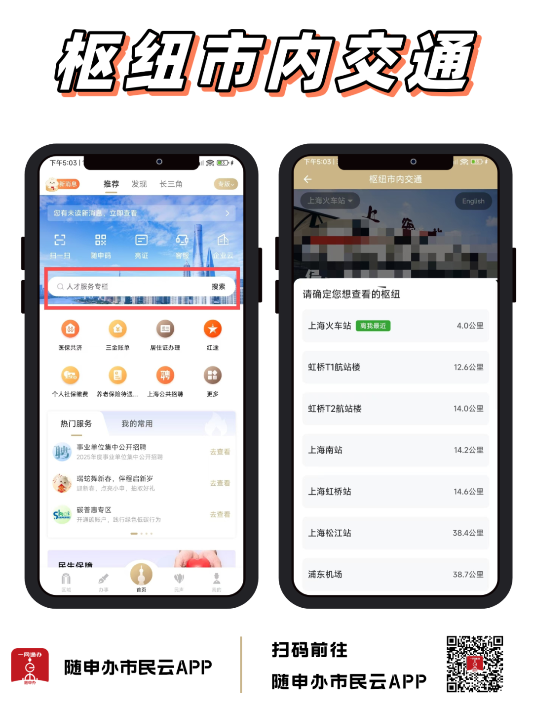 为了帮助市民朋友、来沪旅客能够更顺利地抵达目的地,“随申办市民云”APP“枢纽市内交通”服务,通过接入上海火车站、上海虹桥站、上海南站、浦东机场、虹桥航站楼等上海各大枢纽的实时交通数据,为市民出行提供有力支持。扫描下方二维码即可进入。
