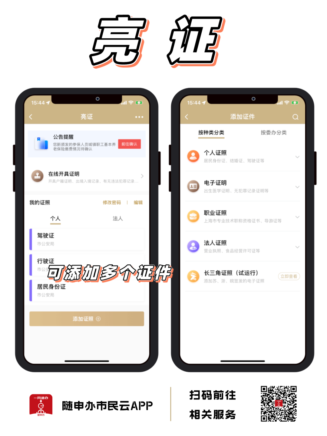 小云提醒大家,“随申办市民云”APP【亮证】可添加身份证等电子证照。